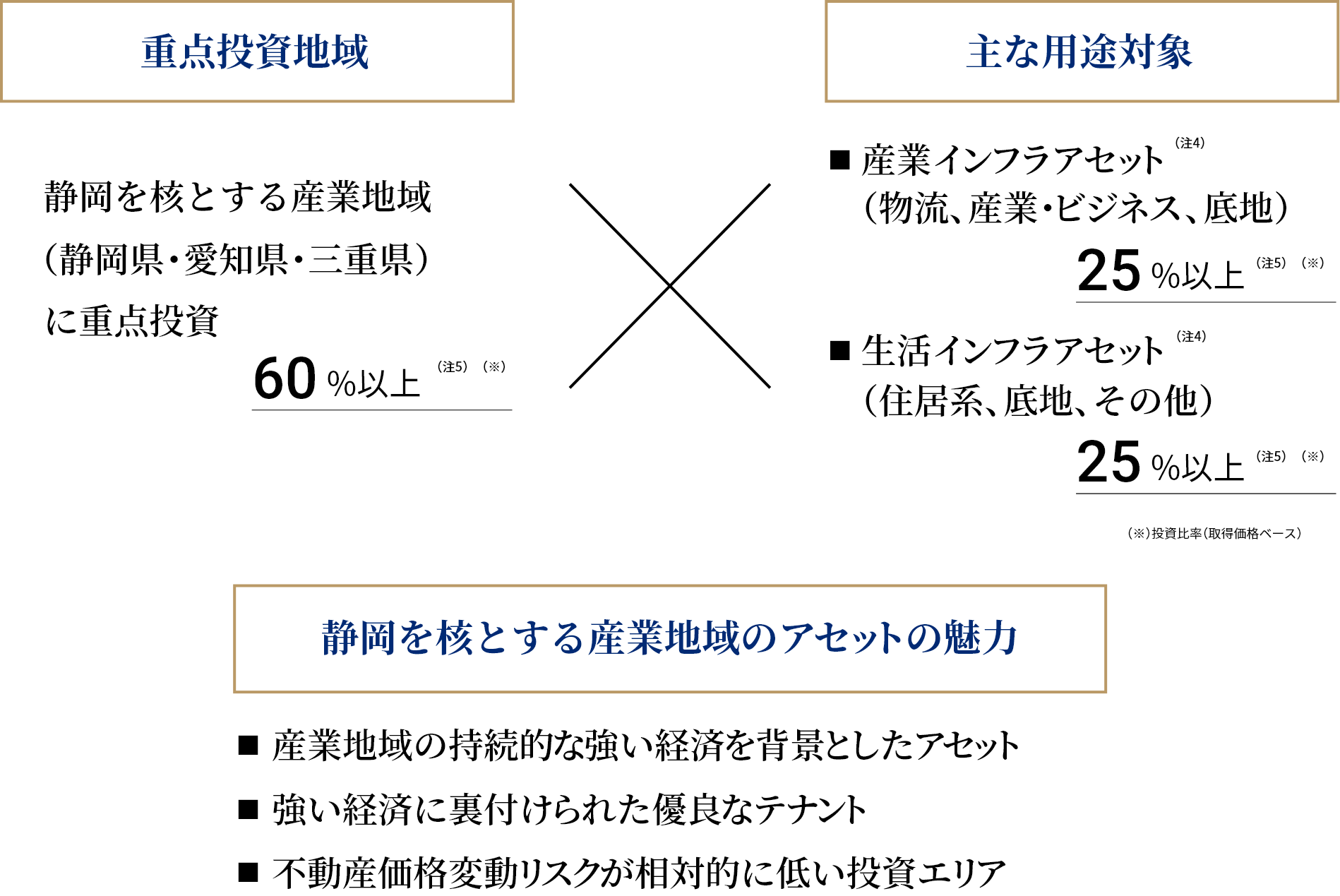 本投資法人は、静岡を核とする産業地域(注2)(静岡県、愛知県及び三重県)への重点投資を基軸としながら、世界第3位の経済規模(GDP)を誇る日本の東西中心地をつなぐ東海道地域への投資を中心に、東海道周辺地域(注3)にも投資をしていくことで、更なる地域経済の活性化や産業の発展に貢献しつつ、投資主価値の向上を図ります。