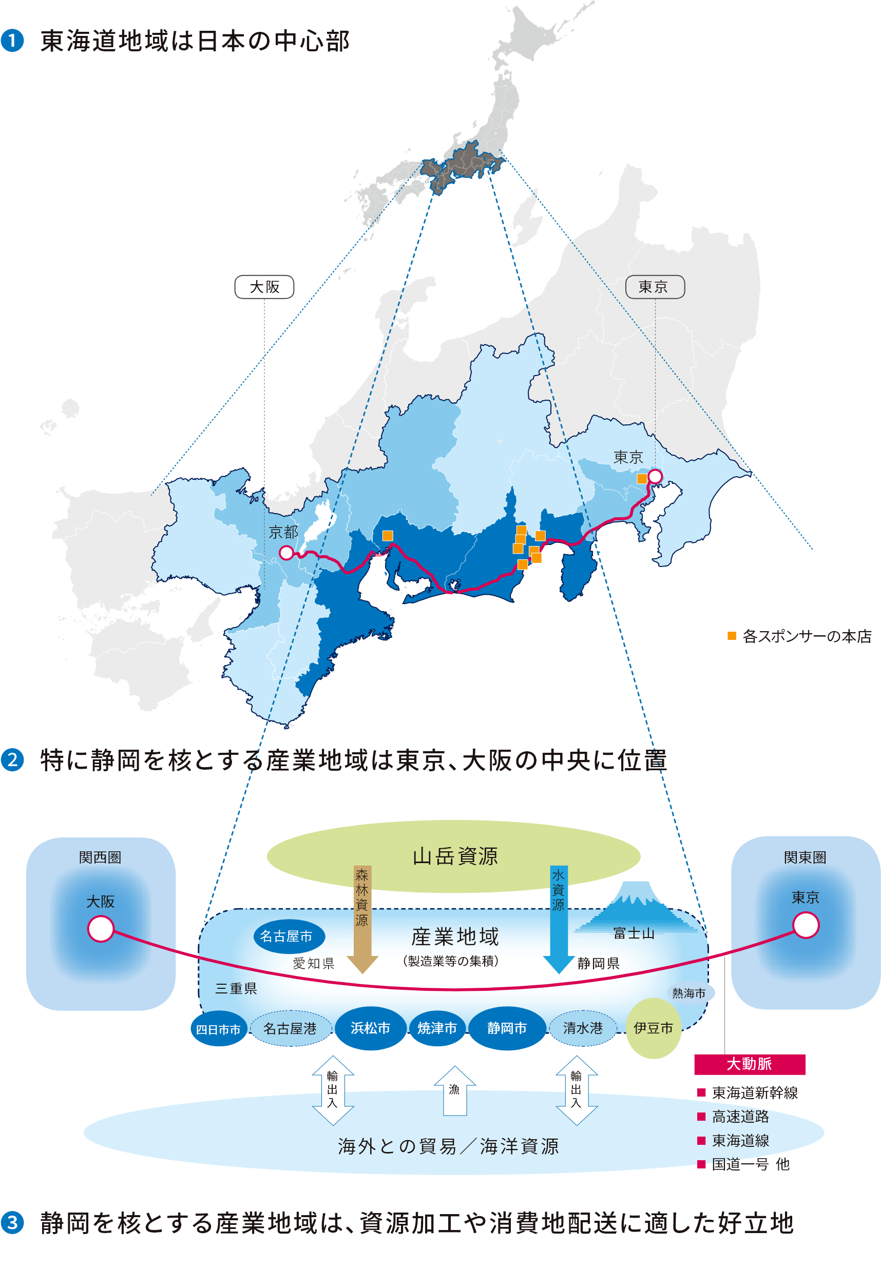 日本の東西中心地をつなぐ大動脈である東海道地域及び東海道周辺地域(以下「東海道地域等」と総称)に着目し、その中でも日本を代表する産業集積を誇る静岡を核とする産業地域への重点投資を行います。