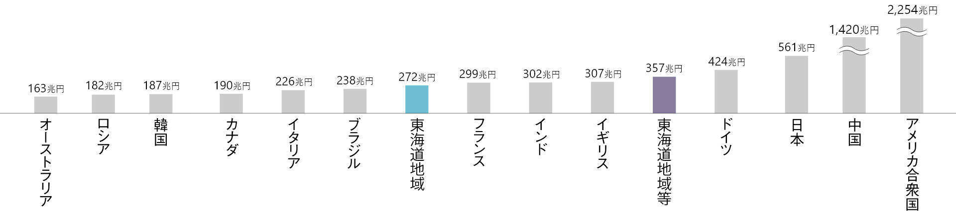 東海道地域とその隣接地域である東海道周辺地域は、日本のGDPの60%以上(2017年現在)を生み出しており、日本の東西の中心地を繋ぐ地域として日本経済の中で非常に重要な位置付けにあるだけでなく、諸外国と比肩する経済規模(GDPベース)を誇ります。